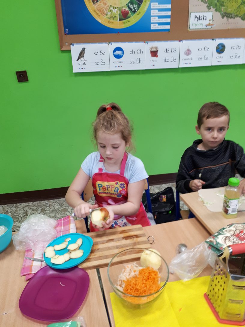 Aby być zdrowym trzeba dobrze się odżywiać – o tym uczyły się dzieci z klasy drugiej. Surówka jarzynowa, zrobiona z kiszonej kapusty, jabłek, marchewki i cebuli smakowała wszystkim i zawierała bardzo dużo witamin, które są potrzebne w walce z jesiennymi infekcjami. Jak przebiegała praca i degustacja pokazują zdjęcia.